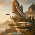 以超现实主义的视觉风格呈现,多栋造型独特充满创意的大别墅错落分布在山间,别墅外观线条流畅且带有未来感的设计元素,带有无边界泳池和飞行器停机坪。周围环绕着茂密且多样的绿化植被,有高大的松树、色彩斑斓的花 ...