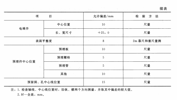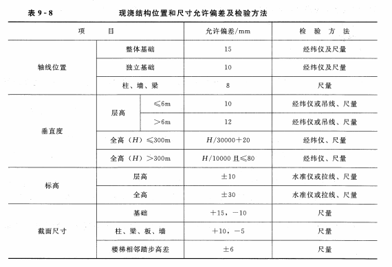 参见《混凝土结构工程施工质量验收规范》(GB 50204—2015)。8·3-2现浇结构的位置和尺寸偏差及检验方法应符合表9-8的规定。检查数量:按楼层、结构缝或施工段划分检验批。在同一检验批内,对梁、柱和独立基础,应抽查构件数量的10%,且不应少于3件;对墙和板,应按有代表性的自然间抽查10%,且不应少于3间;对大空间结构,墙可按相邻轴线间高度5m左右划分检查面,板可按纵、横轴线划分检查面,抽查10%,且均不应少于3面;对电梯井,应全数检查。