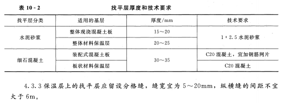 参见《屋面工程技术规范》(GB50345—2012)。4-3-2卷材、涂膜的基层宜设找平层。找平层厚度和技术要求应符合表10-2的规定。
